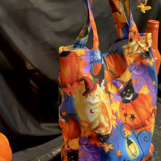 This is a super cute home made Halloween themed bag with the cutest cat witches on it. This would be perfect to hand out candy or to use for trick or treating.